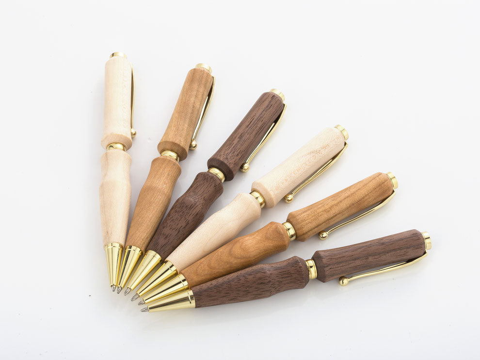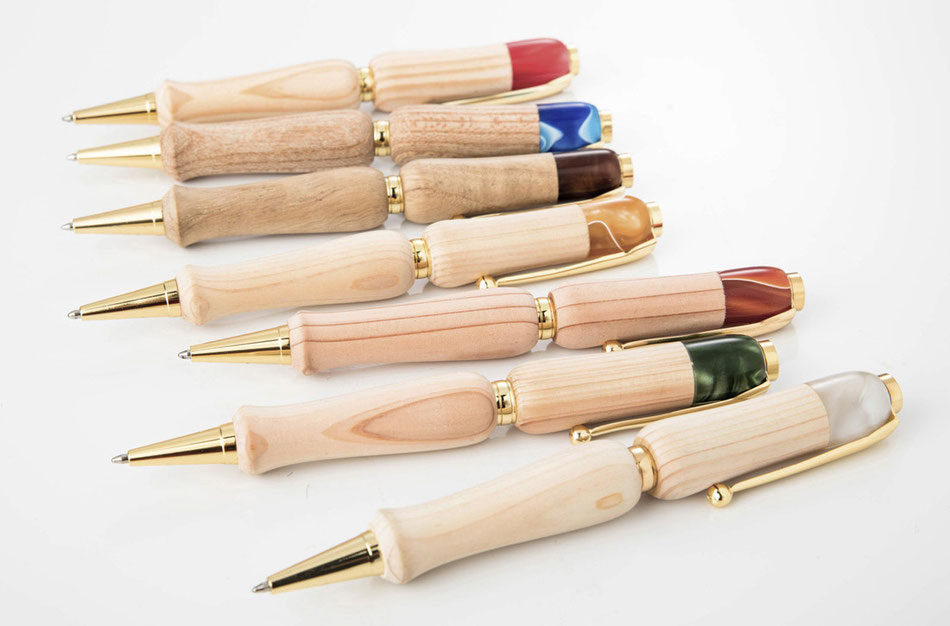 「岐阜県産材ボールペン」シリーズ 古くから飛騨の家具職人達に親しまれてきた木材を厳選して筆記具を作りました。山国岐阜の豊かな自然の恵みである木材を活かし、独自のデザイン形状で手に馴染み、木肌の優しさを感じ、香りを感じられます。ペン軸にはカラーアクリル材がアクセントとなり可愛く美しいボールペンに仕上がりました。