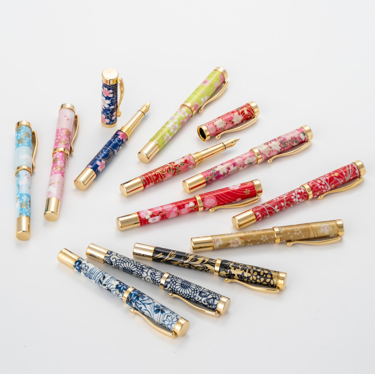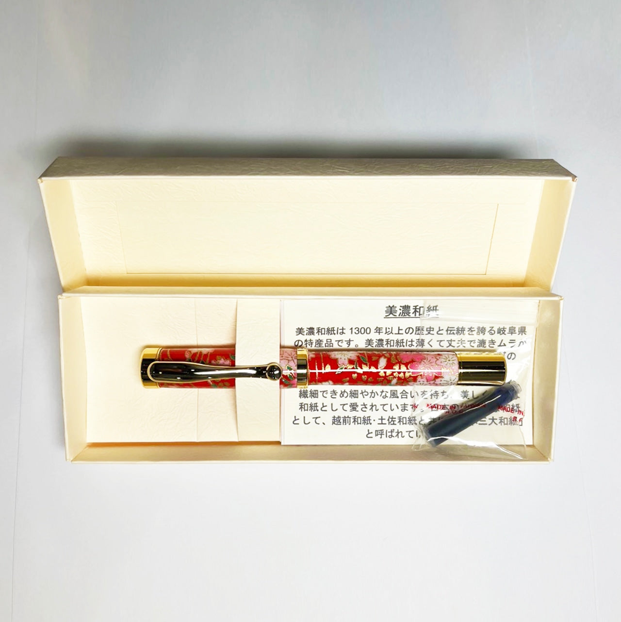 美濃和紙の友禅柄を使用した、高級感あふれる万年筆です。みやびな友禅柄モデルは、女性にも人気のアイテムです。ペン先は合金メッキの中字タイプで、万人に愛される書き味を実現しています。また、カートリッジとコンバータを付け替えることで、インク色の変更も簡単に行うことができます。