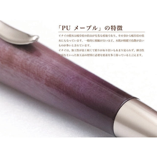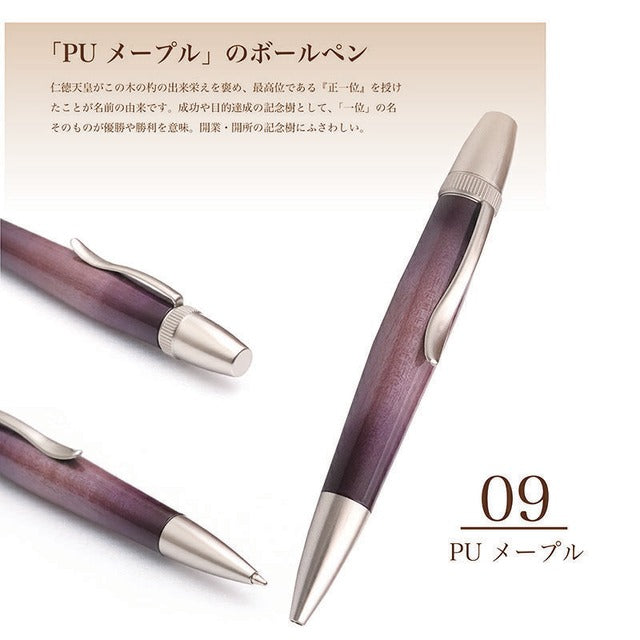 天然木にウレタン塗装をエアーブラシで吹き付けた楽器ようなボールペン。