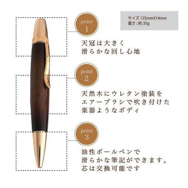 天然木にウレタン塗装をエアーブラシで吹き付けた楽器ようなボールペン。